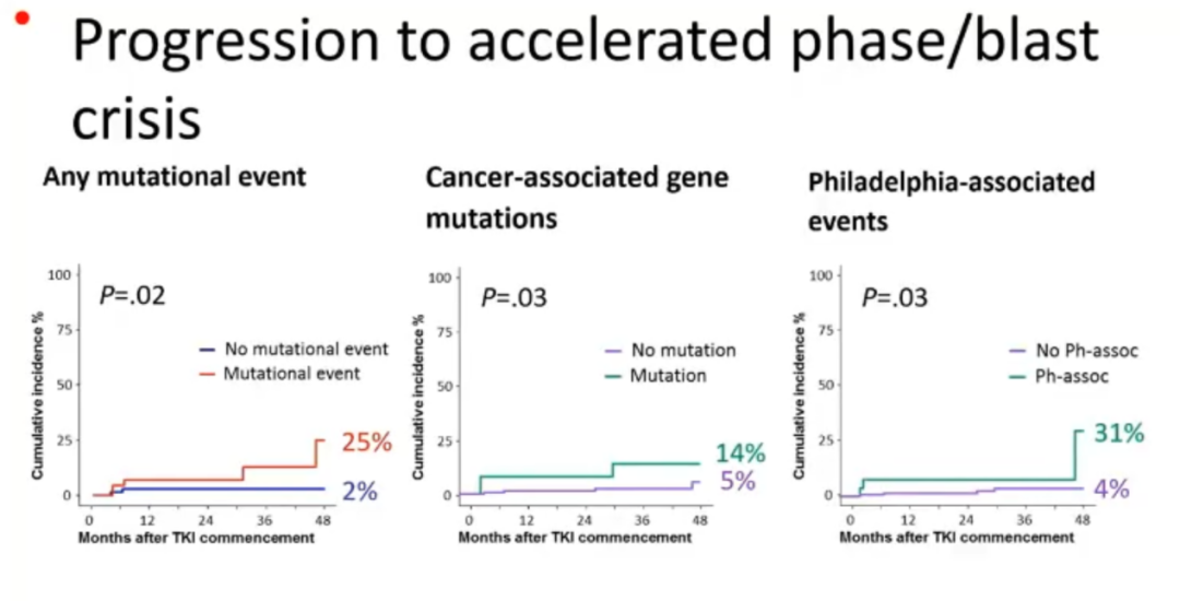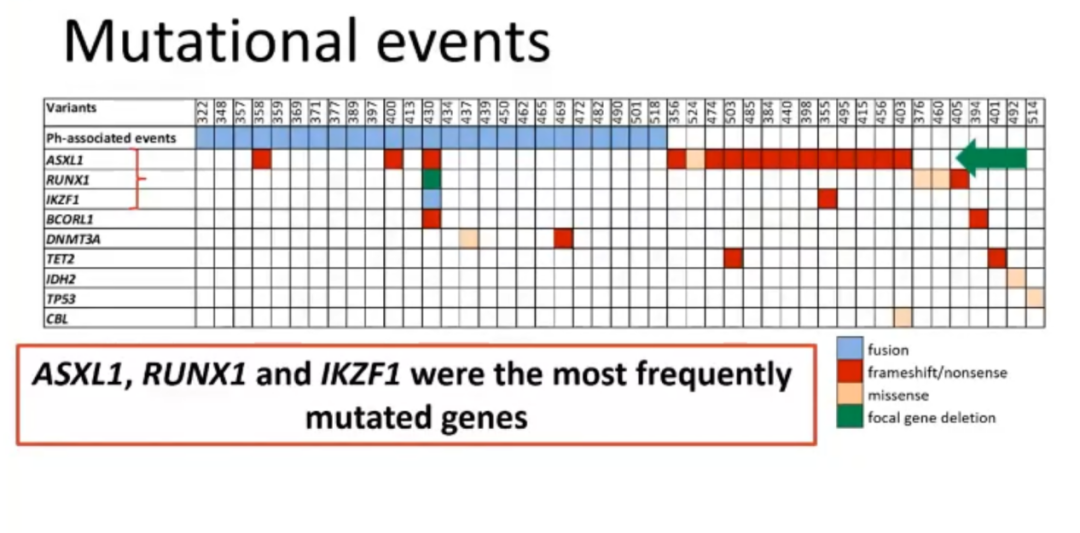 TIDEL Ⅱ研究是一个高剂量伊马替尼积极转换其他TKI的临床研究,其中160/210例患者进行了基因组学研究。33个相关基因中,25例病人(16%)中9个基因VAF值≥5%,其中ASXL1最常见(占10%),其他常见的突变基因是RUNX1/BCORL1/KIZF1/DNMT3A等。25例(16%)中可见Ph相关事件。5例同时具有肿瘤相关基因突变和Ph相关事件,总计45例(28%)具有至少一种基因组学事件。初诊时肿瘤相关基因是否突变与PFS和FFS不良显著相关,突变者MR4率也较低,分别为27%:71%(p=0.01)。同样,Ph相关事件同样对预后有不利影响,存在Ph相关事件者MR4率偏低,分别为为47%:68%。此外,具有这些基因组学事件的患者更容易进展或者出现激酶区突变。多因素分析发现,PFS仅与肿瘤相关基因突变相关。该研究可以得出结论,无论高剂量伊马替尼还是积极转TKI治疗,基因组学事件都与不良预后相关,因此,将这些基因组学事件与ELTS评分组合将是预测患者预后更有价值的方式。