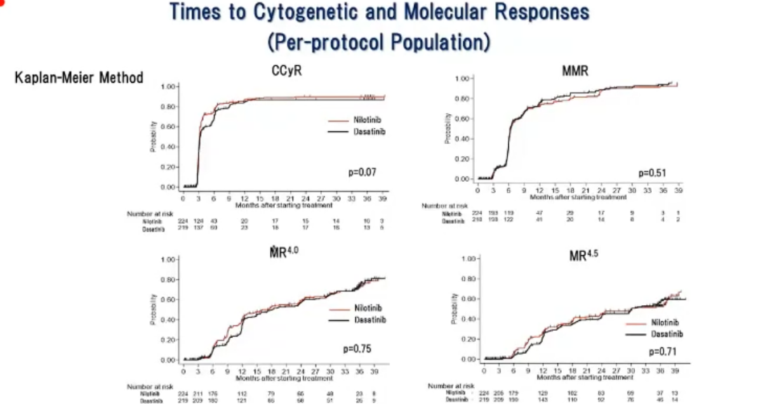 在这些研究中颇有亮点的JALSG CML 212是一个前瞻性多中心开放标签随机对照III期研究,主要终点是18个月的累积MR4.5率。82个中心454例新诊断CML患者按照sokal评分进行随机分组。尼罗替尼和达沙替尼18个月的累积MR4.5分别为33%:30.8%(p=0.62),坚持用药者比例分别为75.9%:79.6%(p=0.36),两组PFS、EFS和OS均未见显著性差异。这是全球首个前瞻性随机比较二代TKI药物效果的研究。