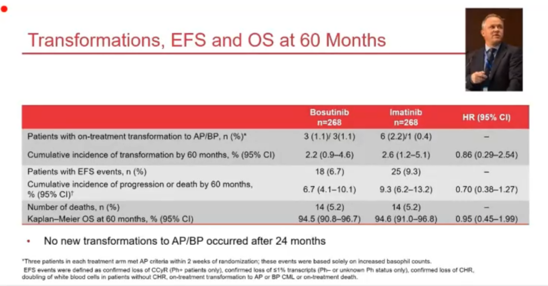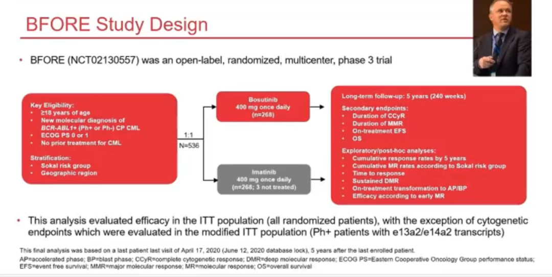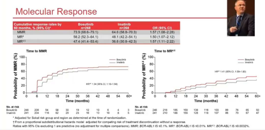 BFORE研究是一个开放标签的三期随机对照研究,536例新诊断CML患者按照1:1随机入组。截止5年分析时,博苏替尼和伊马替尼两组分别有59.7%和57.4%的患者坚持用药,累积MMR率分别为73.9%:64.6%,MR4.5率分别为47.4%:36.6%。Sokal越高,分子学疗效差异越明显,其中高危组MR4.5率分别为46.4%:24.6%。博苏替尼和伊马替尼因为不良反应永久停用率分别为25%:12.5%,因为疗效不佳停用率分别为4.9%:16.2%,博苏替尼常见的不良反应包括腹泻(75%),恶心(37.3%),血小板减少(35.8%)和ALT增高(33.6%)。