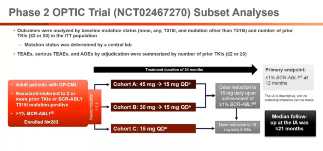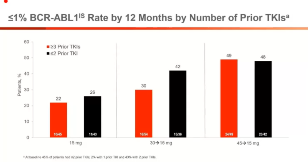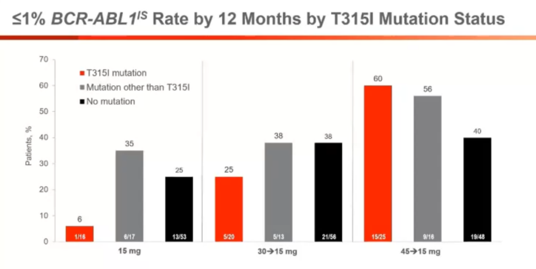 OPTIC是评价3组不同起始剂量ponatinib治疗难治复发CML的三期随机研究,所有患者均经过2线以上治疗或者存在T315I突变。一共纳入283例,按照起始剂量随机分为45mg(A),30mg(B),15mg(C)三组。12个月BCR-ABLis≤1%的比例在A组患者最高, T315I突变者这种差异最为明显,分别为A组60%,B组25%和C组6%,非T315I突变者这种差异较小,但是A组依然有一定优势,不同治疗线数之间该效果的差异则不明显。同样的,血管事件发生率在A组和≥3线治疗组中有增多的趋势。