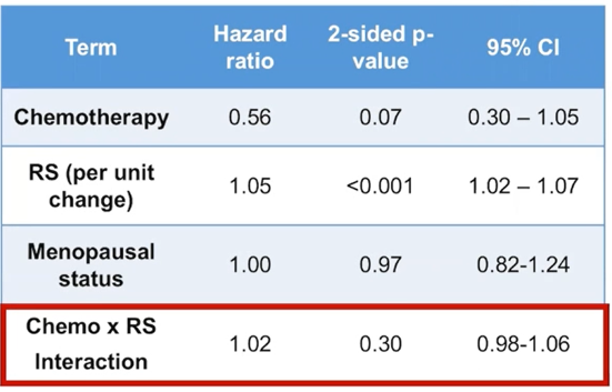 交互性分析表明,化疗不能显著改善RS≤25分患者的iDFS(HR=1.02,95%CI:0.98~1.06,P=0.30)。与绝经后患者相比,绝经前患者iDFS可从化疗中显著获益,绝对获益5.2%(94.2% vs 89.0%, HR=0.54, 95%CI:0.38~0.76, P=0.0004)。