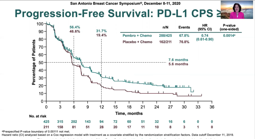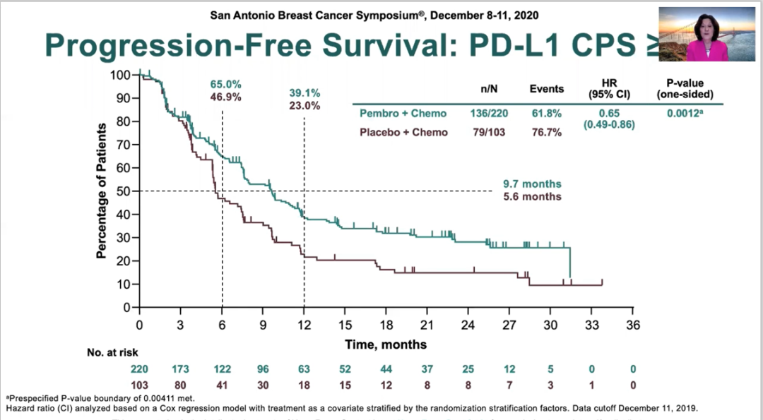 KEYNOTE-012、-086、-119试验均证实了在转移性三阴性乳腺癌(mTNBC)患者中pembrolizumab单药治疗具有持久的抗肿瘤活性和良好的安全性。此次大会报道的是pembrolizumab联合化疗对比安慰联合化疗一线治疗局部晚期不可手术或mTNBC的KEYNOTE-355研究无进展生存期(PFS)以及关键的次要研究终点的结果。