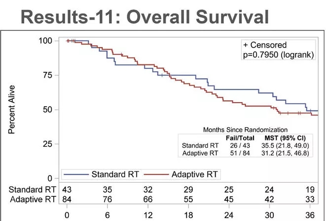 2年局部区域控制率上,标准治疗组的总体2年局部区域肿瘤无进展时间为27.5个月,而自适应组为28.4个月。研究中心报告的适应性组的射野内局部区域无进展率更好,2年时的差异为11%,对应的中位肿瘤剂量差异为11 Gy。2年时原发性肿瘤控制的差异为17%,有利于自适应组。