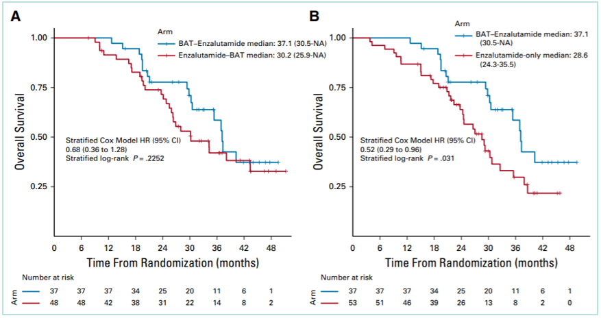 结果显示,BAT交叉至恩扎卢胺(37.1个月)相较于恩扎卢胺交叉至BAT(30.2个月)的死亡风险降低32%(HR 0.68,95%CI:0.36~1.28,P=0.23),相较于单独使用恩扎卢胺的死亡风险降低48%(HR 0.52,95%CI:0.29~0.96,P=0.03)。