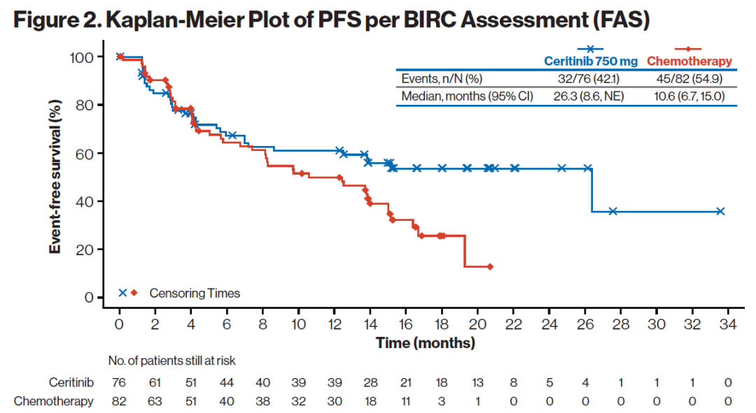 • 第1组-后线:既往使用过ALKi;既往接受过脑部放疗,但放疗未控制住的患者,这组患者接受塞瑞替尼治疗后中位PFS为7.2个月,中位OS为24个月。