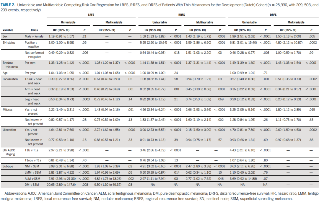 表2.荷兰发展队列中薄黑色素瘤患者LRFS,RRFS和DRFS的单变量和多变量竞争风险COX回归分析