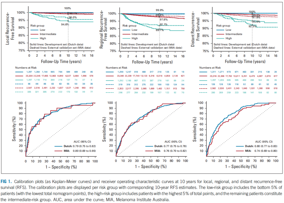 图1.局部、区域和远处无复发生存率(RFS)的10年校正图(Kaplan-Meier曲线)和受试者操作特征曲线。校准图按风险组显示,并附有相应的10年RFS估计值。低危组包括最低5%的患者(列线图总分最低),高危组包括最高5%的患者,其余患者构成中危组。AUC,曲线下面积;MIA,澳大利亚黑色素瘤研究所。