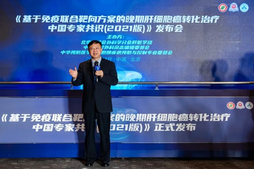 2021年5月27日,《基于免疫联合靶向方案的晚期肝细胞癌转化治疗中国专家共识(2021版)》(以下简称《共识》)发布会在北京举行。本次发布会是由北京医学会外科学分会肝脏学组、中华肝胆外科杂志委员会、中华预防医学会肝胆胰疾病预防与控制专业委员会联合主办,会议就《基于免疫联合靶向方案的晚期肝细胞癌转化治疗中国专家共识(2021版)》相关要点开展了深入的讨论,以指导临床实践,规范医疗行为,推动学科发展。