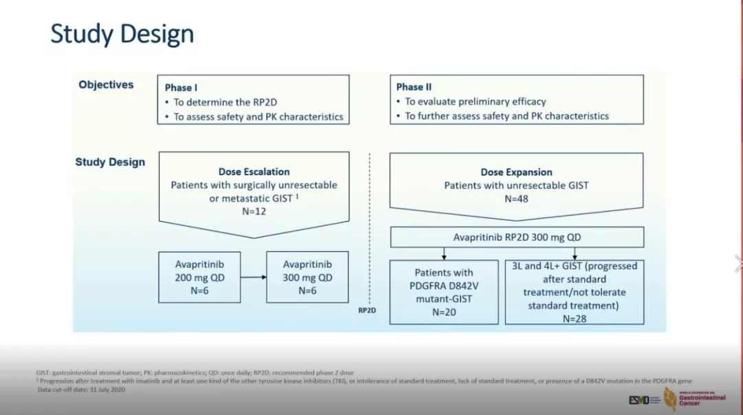 方法:无法切除或转移性GIST的成年患者被纳入了这项开放标签的Ⅰ/Ⅱ期桥接研究第2部分。该研究分为两部分:剂量递增部分(Ⅰ期,200 mg和300 mg每日一次[QD])和剂量扩大部分(Ⅱ期,PDGFRA d842v突变和3L/4L+的GIST患者)。剂量递增部分的主要终点是推荐的Ⅱ期剂量(RP2D)和安全性;剂量扩大部分的主要终点为总缓解和安全性(图1)。