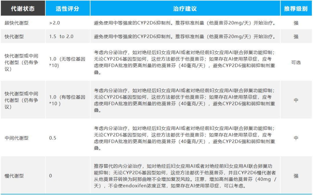 临床中,CYP2D6基因型具有多态性(包括等位基因*2、*2A、*3、*4、*6、*7、*8、*9、*10、*14、*17、*29、*35、*41A),美国FDA建议ER阳性乳腺癌患者在接受TAM治疗前进行CYP2D6基因型检测,以确保药物的疗效;而临床药物基因组学实施联盟(CPIC)则于2018年发布了CYP2D6和他莫昔芬治疗的指南(如下表)。总体上,对于快或超快代谢型人群,可以选择标准剂量TAM(20mg)治疗;中间代谢型可选择AI替代或增加TAM剂量(40mg);而慢代谢型应选择AI替代,增加TAM无法弥补疗效。