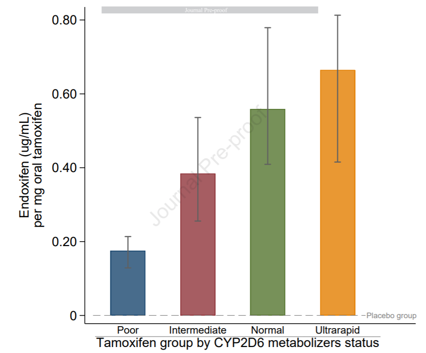 结果发现,CYP2D6缓慢、中间、正常和超快速代谢型女性,口服每毫克TAM的中位Endoxifen水平分别为0.18 ng/ml、0.38 ng/ml、0.56 ng/ml 和 0.67 ng/ml。