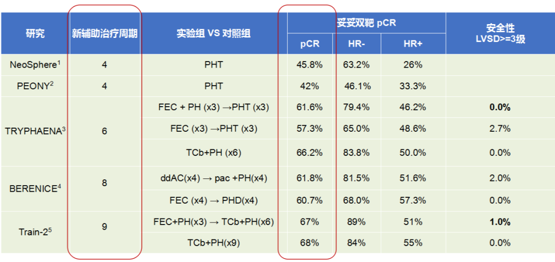 随着时代的进步和新药的出现,HER2阳性乳腺癌的新辅助治疗进入了双靶时代。Neosphere研究是最早进行双靶新辅助治疗的研究,该研究结果表明,在新辅助治疗中帕妥珠单抗加曲妥珠单抗的双靶抗HER2联合多西他赛的方案使患者的pCR率提升至45.8%,且不良反应与曲妥珠单抗单药组大体一致。在此研究之后,PEONY研究、TRYPHAENA研究、BERENICE研究、Train-2研究应用双靶新辅助对HER2阳性乳腺癌患者进行治疗,都取得了较好的pCR率,且安全性良好。