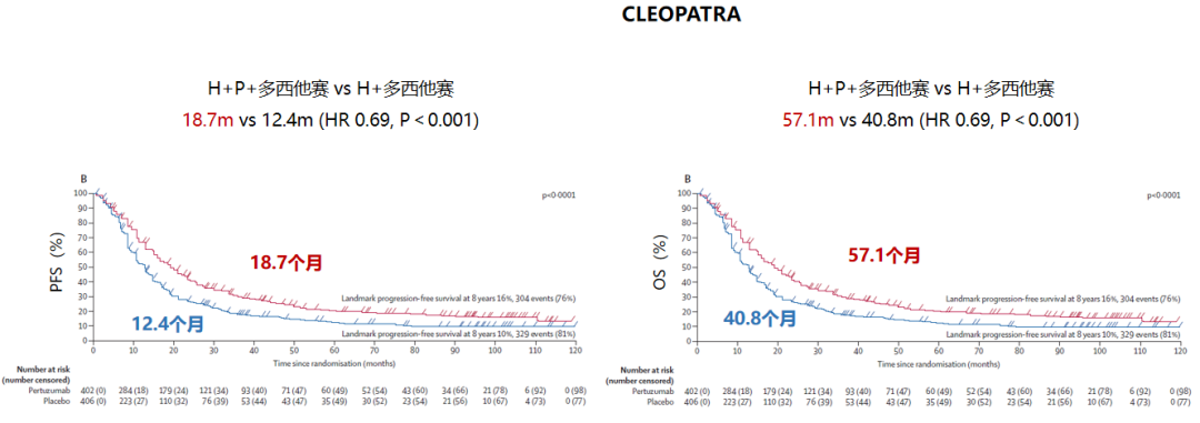 对于未接受过曲妥珠单抗者治疗的患者,优先选择双靶向方案。CLEOPATRA研究奠定了帕妥珠单抗+曲妥珠单抗+多西他赛的晚期一线治疗地位。该研究将HER2阳性转移性乳腺癌患者随机分为两组,分别接受一线安慰剂+曲妥珠单抗+多西他赛或帕妥珠单抗+曲妥珠单抗+多西他赛治疗,经过长达8年随访,最终结果显示,双靶组的PFS为18.7个月,显著优于对照组的12.4个月(HR=0.69,95%CI:0.59~0.81)。双靶组中位OS为57.1个月,显著优于对照组的40.8个月(HR=0.69,95%CI:0.58~0.82)。