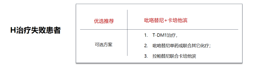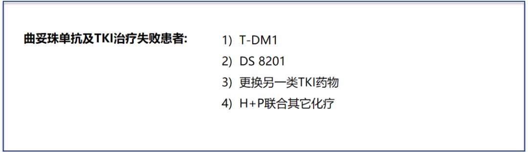 EMILIA研究显示,T-DM1对比卡培他滨+拉帕替尼显著延长了患者PFS和OS。但考虑当前药物可及性,因此,2021版共识对曲妥珠单抗治疗失败后的患者,推荐T-DM1为可选方案。此外,吡咯替尼单药或联合其它化疗;拉帕替尼联合卡培他滨也作为可选方案。