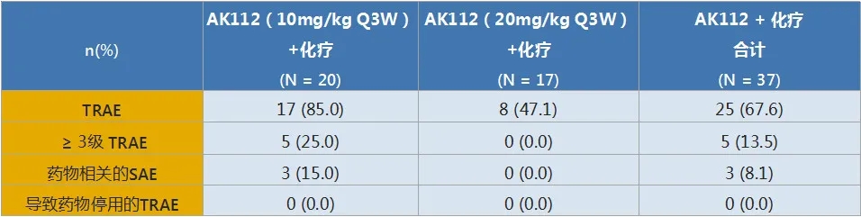 4例(10.8%)受试者发生输液反应,均为1级和2级;≥3级的AK112相关的TRAE发生率为13.5%(5/37),其中≥2例的TRAE包括感染性肺炎(5.4%,2/37)和血小板计数降低(5.4%,2/37)。