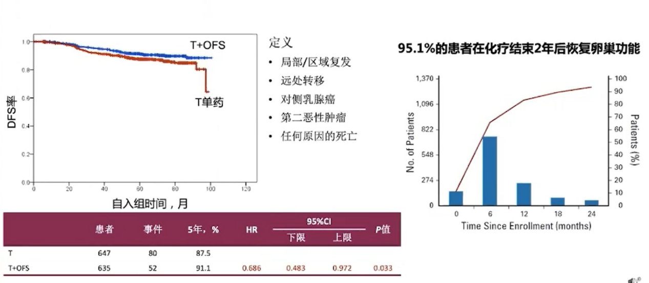 结果显示,与TAM单药相比,TAM+OFS可显著改善患者DFS,患者5年DFS由87.5%提升到了91.1%;该研究还提示,95.1%的患者在化疗结束2年后恢复了卵巢功能。这些大型的临床研究都证明了在绝经前患者中加入OFS的重要性。
