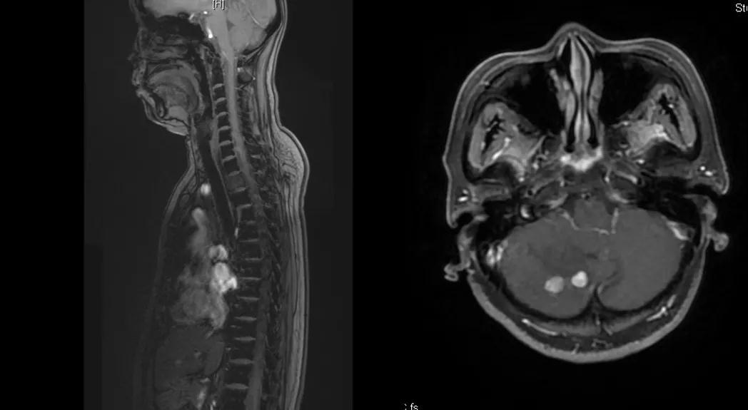 曲妥珠单抗辅助治疗结束6个月后,患者出现左侧胸部疼痛,ECT检查提示:左侧第4、5肋骨及T2胸椎转移;MR提示:T2椎体转移,肝S6段异常强化灶,考虑转移瘤可能性大;脑转移(图1)。