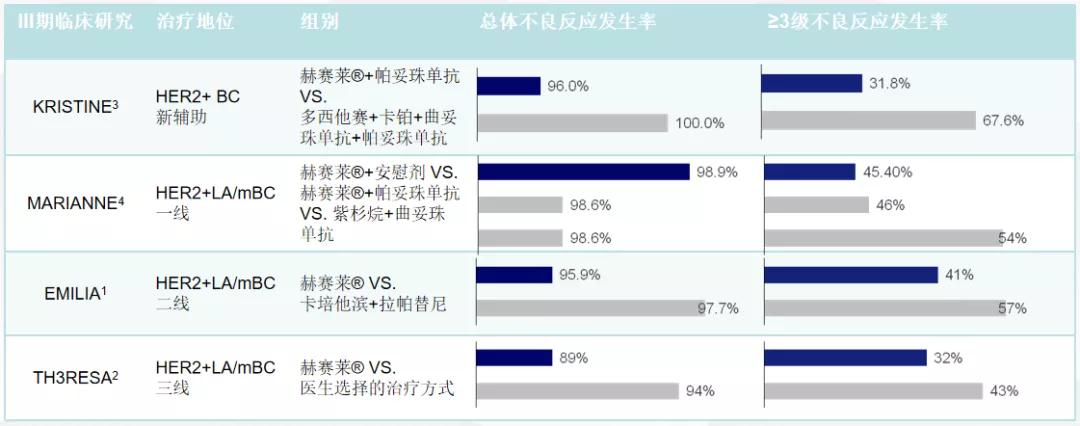 T-DM1的另一个突出优势是良好的安全性。纵观KRISTINE、MARIANNE、EMILIA、TH3RESA等早期或晚期治疗研究显示,T-DM1的不良反应发生率普遍低于以化疗为基础的联合治疗方案(表1)。