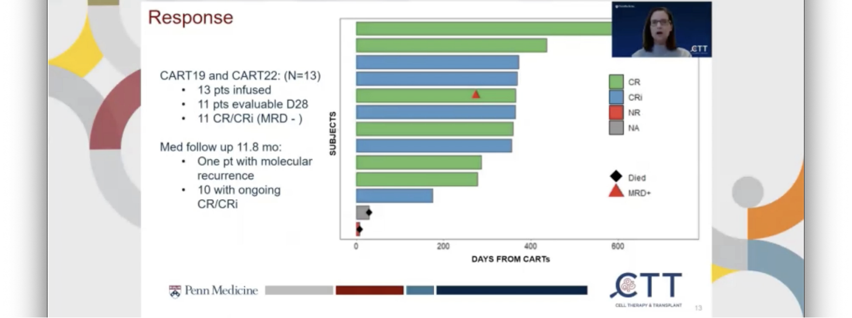 我们医院潘静主任团队做过儿童难治复发B急淋采用CD19-22 两个靶点的CAR-T序贯治疗,一年无病生存率为 79.5%,随访到2年60%的患者为无病生存状态。这个工作让我们看到这种两种靶点的CAR-T细胞治疗可以使患者获得更加持久的完全缓解,安全性较好。