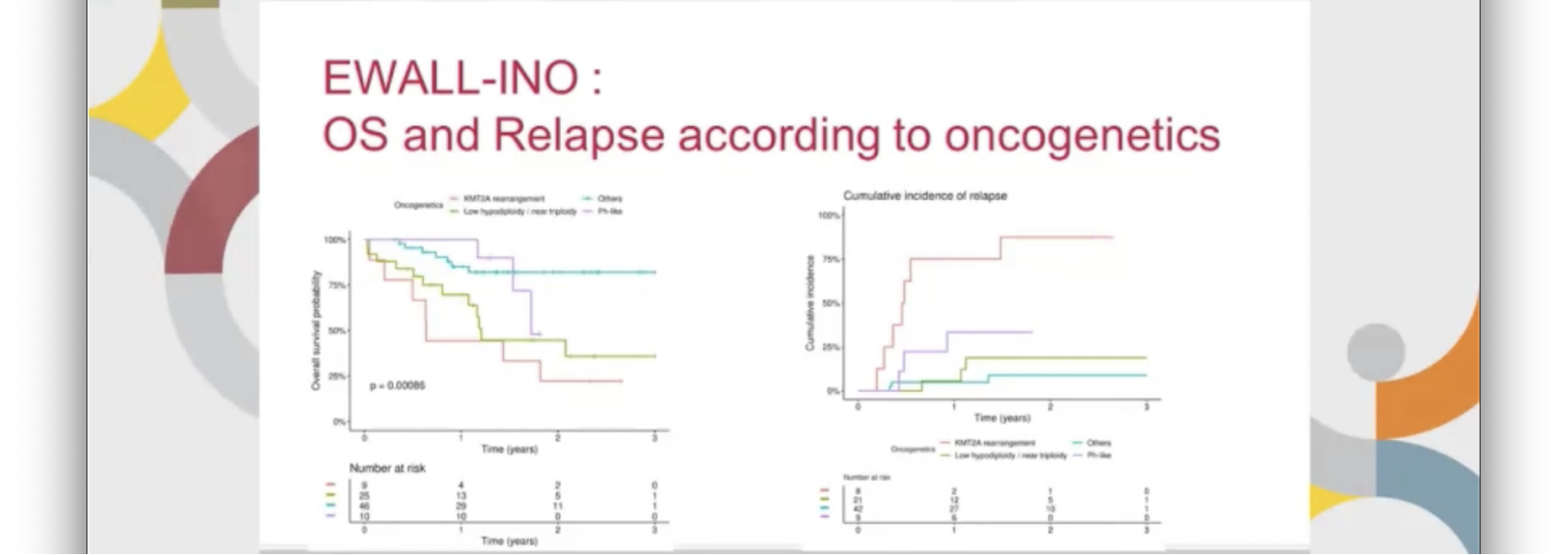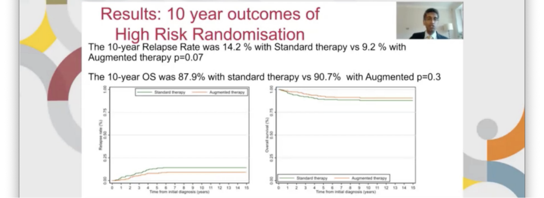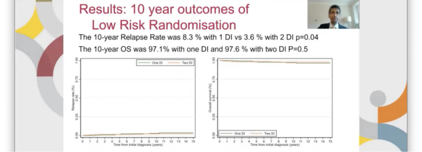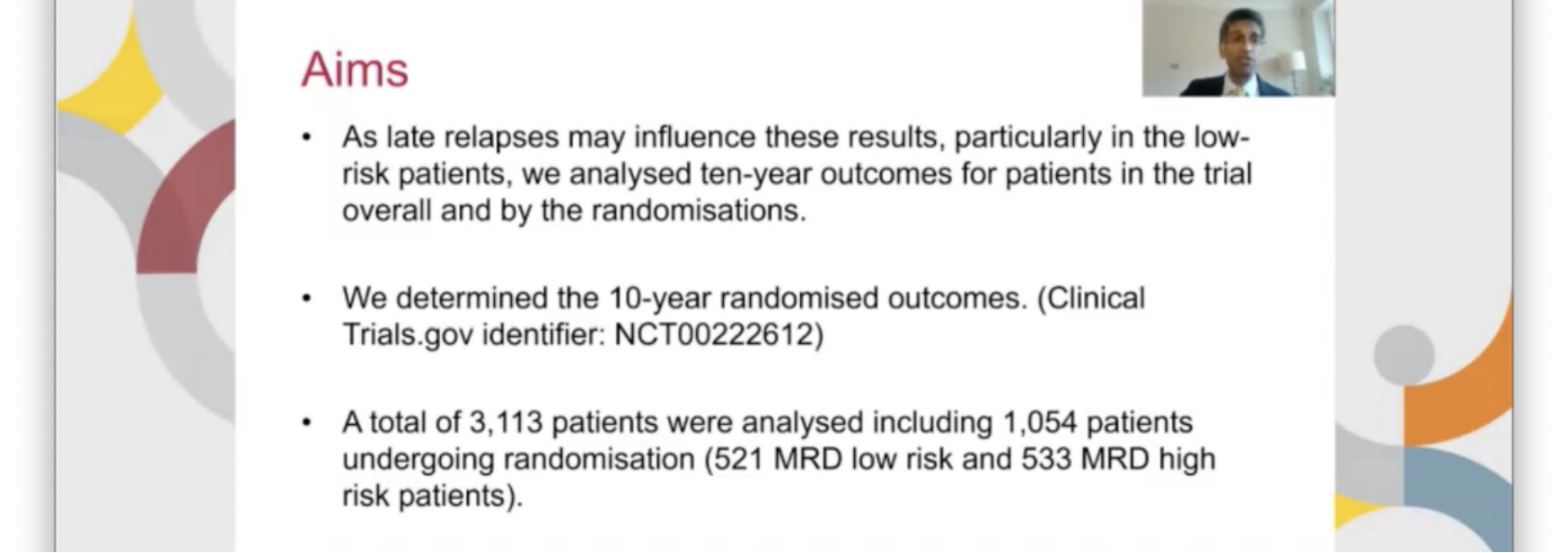 共有3113例患者纳入分析,结果表明,中位随访时间9.4年,10年的复发率是10.7%,无事件生存率是84.8%,总生存89.6%。对于MRD低危的患者,把强化治疗从标准的2个疗程减为1个疗程后,可以看到实际的疗效并没有受到影响。对于MRD高危的患者,特别是具有高危染色体异常的患者,采用加强治疗方案后,患者的疗效有所提高。