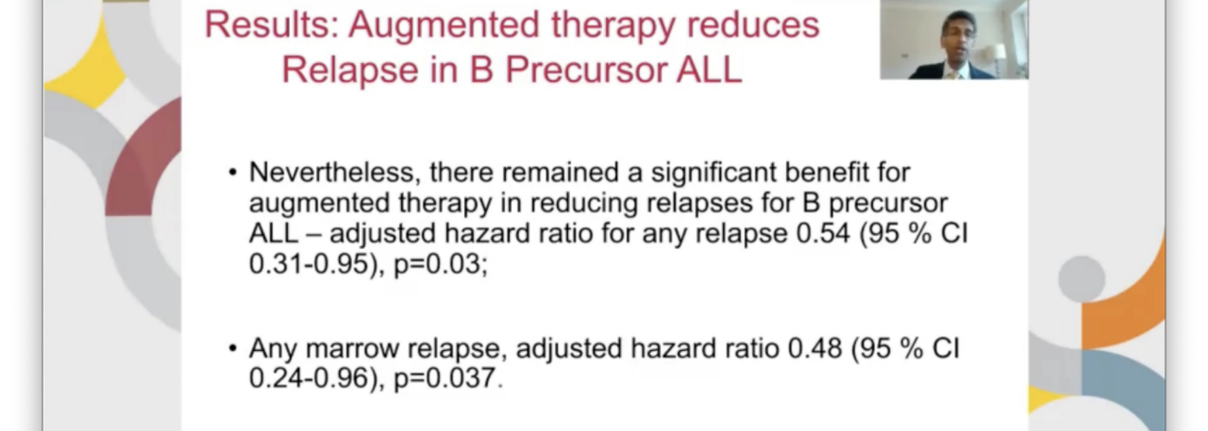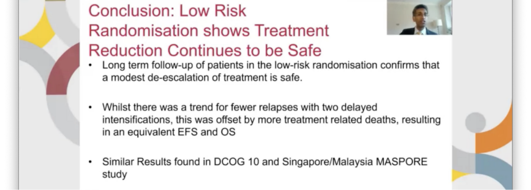 这是一个长期随访的结果,它提示我们对于ALL患者,对于低危的患者减低治疗强度并没有影响疗效,可能会减低毒性;对于高危的患者,加强治疗之后可以提高疗效。目前有关ALL治疗理念就是要对患者进一步分层,从而实现更精准、更个体化的治疗