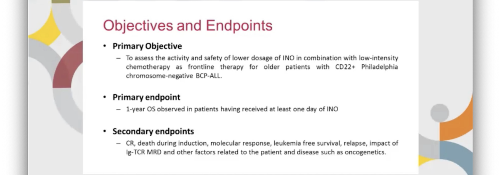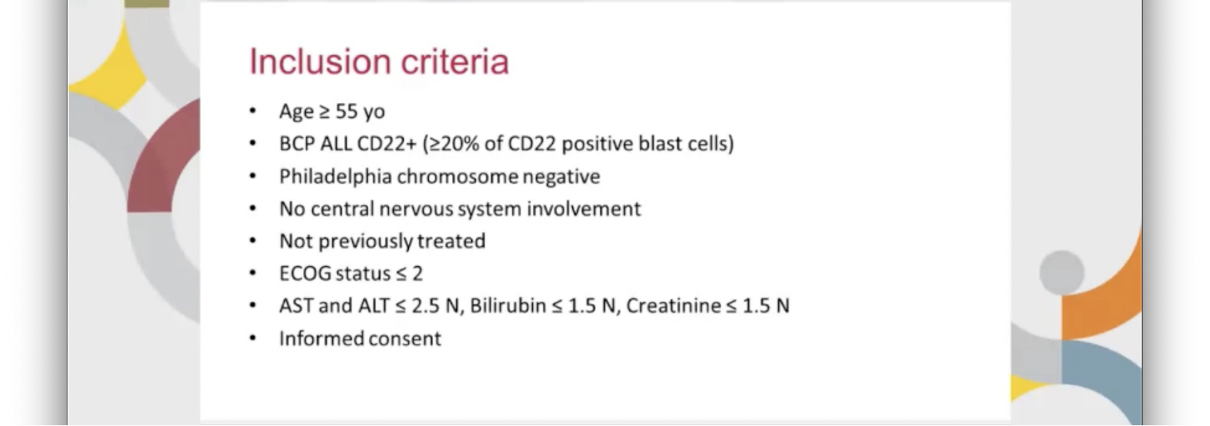 这是一项来自欧洲成人急淋工作组的单臂、前瞻性、多中心临床试验(大会摘要号:511),主要针对初诊的老年B-ALL、Ph阴性且表达CD22的白血病细胞,采用联合CD22单抗(Inotuzumab ozogamicin, Ino)治疗来观察它的疗效和安全性。