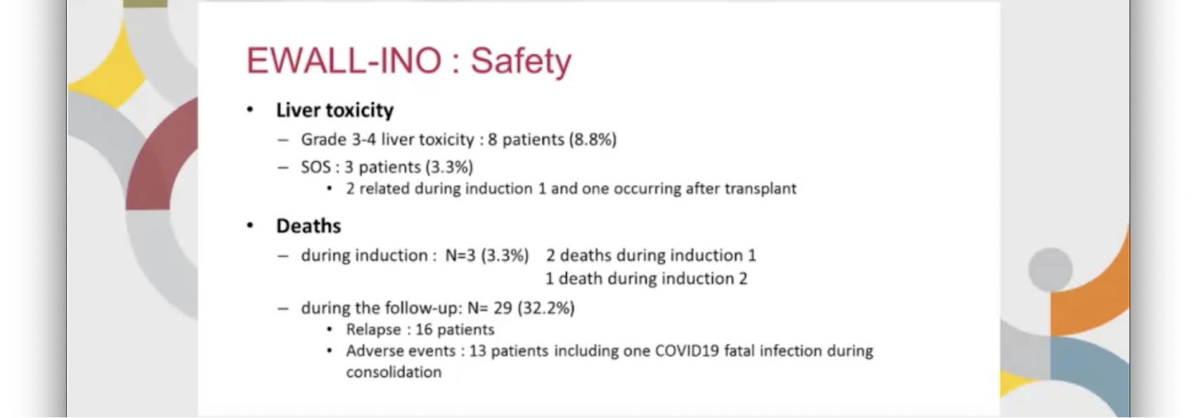 老年ALL的预后非常差,化疗的缓解率非常低,治愈率也很低,这可能与患者年龄较大、脏器功能差、剂量减量等有关,并且老年人的染色体、基因存在更多的高危因素。该项研究在减低剂量化疗的同时,加入5次Ino单抗来治疗,Ino单抗耦联了一个抗肿瘤的抗生素(卡奇霉素),这个抗体的主要副作用是引起肝毒性,尤其是肝窦阻塞综合征(SOS)。患者可能会有肝脏的进行性肿大、疼痛、黄疸、腹水等表现。
