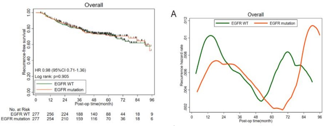 结果发现,共计245例(27.6%)患者出现复发,经过数据匹配后发现,EGFR突变型及野生型患者的复发模式,包括脑部复发状态均无差异;多因素发现,EGFR基因突变状态与患者颅脑复发风险无关(HR=0.88, 95%CI 0.54-1.46, P=0.632)。对于携带EGFR基因突变的患者而言,第一个复发高峰在24-26个月,较野生型患者延迟约10个月,第2个复发高峰约滞后于野生型患者2年。
