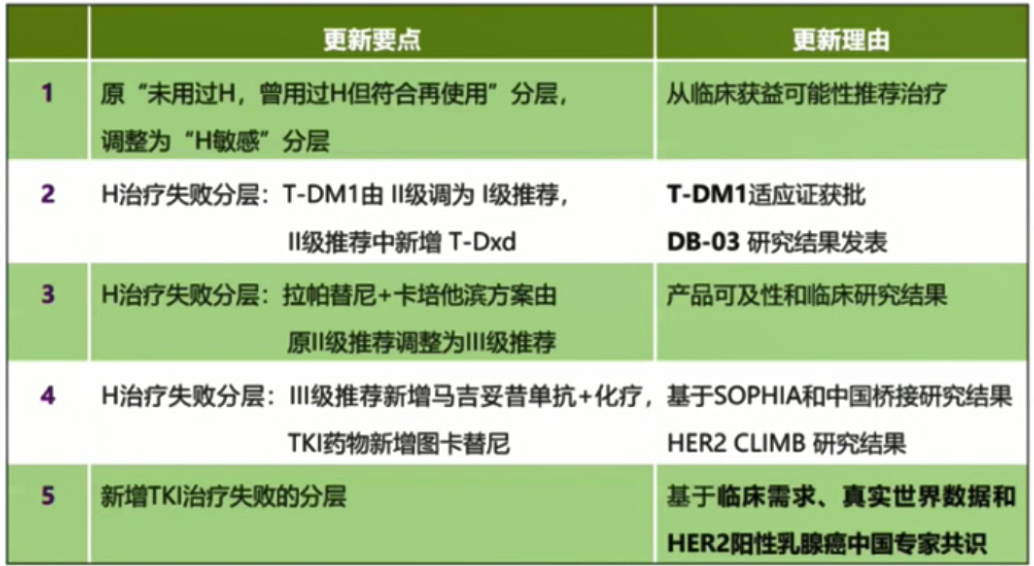 1、将原“未用过H,曾用过H但符合再使用”分层,调整为“H敏感”分层。该分层的各级治疗推荐和证据等级没有变化。
