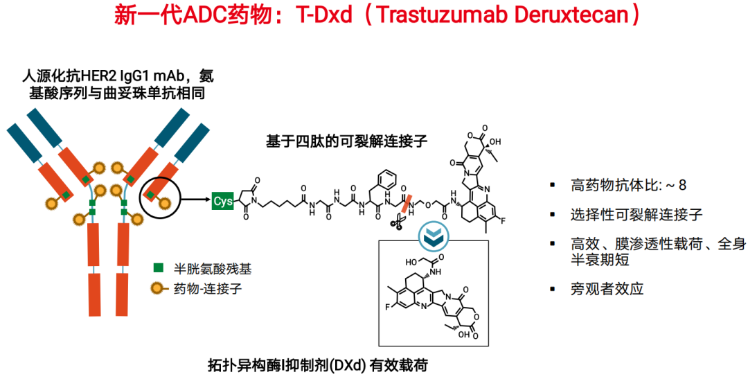我们知道基于EMILIA研究,T-DM1较早前已经是国际上的HER2阳性晚期标准二线治疗方案之一。然而,新一代ADC药物T-DXd已经成功挑战T-DM1。T-DXd是由人源化抗HER2 IgG1 mAb、基于四肽的可裂解连接子、拓扑异构酶I抑制剂(DXd)有效载荷构成,具有:高药物抗体比(~8),选择性可裂解连接子,高效、膜渗透性载荷、全身半衰期短,旁观者效应等优势。