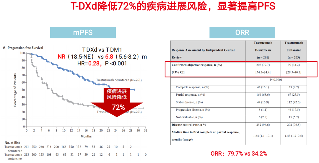 今年3月份发表于NEJM杂志上的DESTINY-Breast03研究证实,相较于T-DM1,T-DXd可显著延长患者PFS(NR vs 6.8个月),降低72%的疾病进展或死亡风险(HR 0.28,P<0.001);ORR也提高了一倍多(79.7% vs 34.2%)。