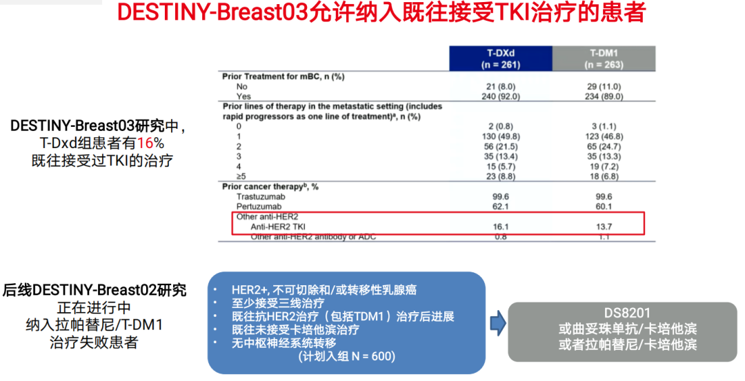 在TH3RESA研究中,拉帕替尼失败后选择T-DM1可较医生选择的治疗方案,延长PFS 2.9个月和延长OS 6.9个月。在DESTINY-Breast03研究中,有16.1%的患者既往接受过TKI治疗,尤其是亚洲患者中,有高达22.8%的患者既往接受过TKI治疗,提示T-DXd在此类患者中仍有治疗获益,正在进行中的DESTINY-Breast02研究纳入的正是拉帕替尼或T-DM1失败的患者,期待其研究结果能够提供更多证据。