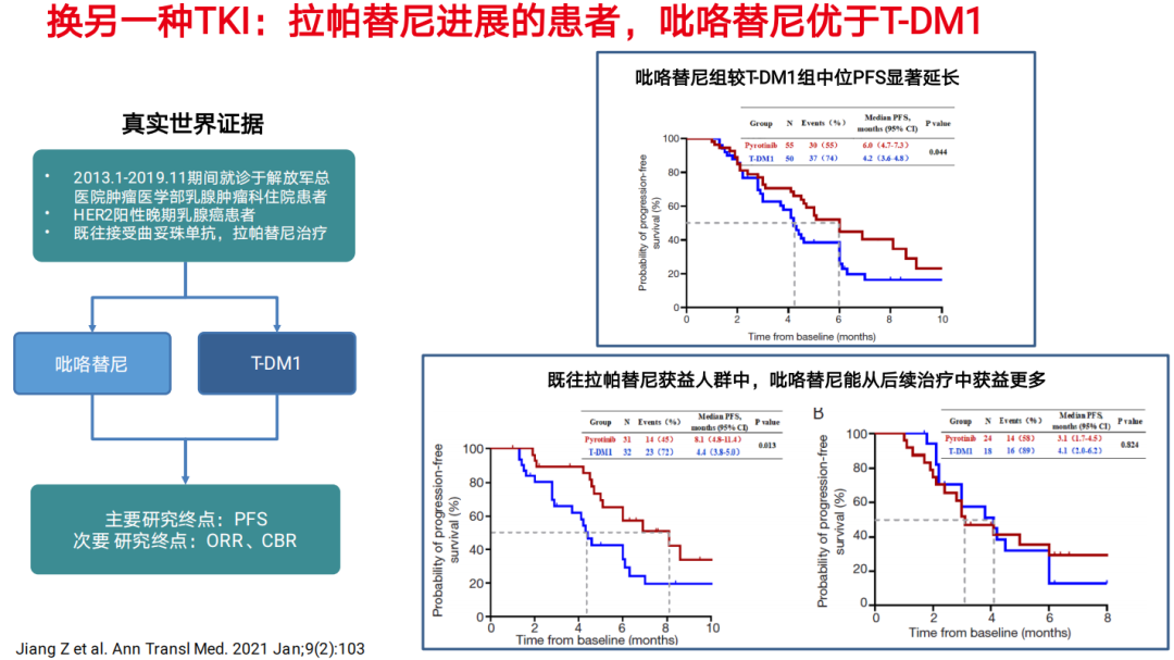 已有两项单臂研究显示,在既往曲妥珠单抗、拉帕替尼治疗失败的患者中,再次接受以曲妥珠单抗为基础的方案,仍可获得4.6~4.9个月的PFS;江泽飞教授领导的一项真实世界研究则提示,对于拉帕替尼进展的患者可以换用另一种TKI吡咯替尼,所获PFS优于换用T-DM1。此外,TKI治疗失败的患者也可参加严格设计的临床试验,国内已有多款ADC正在研究中。