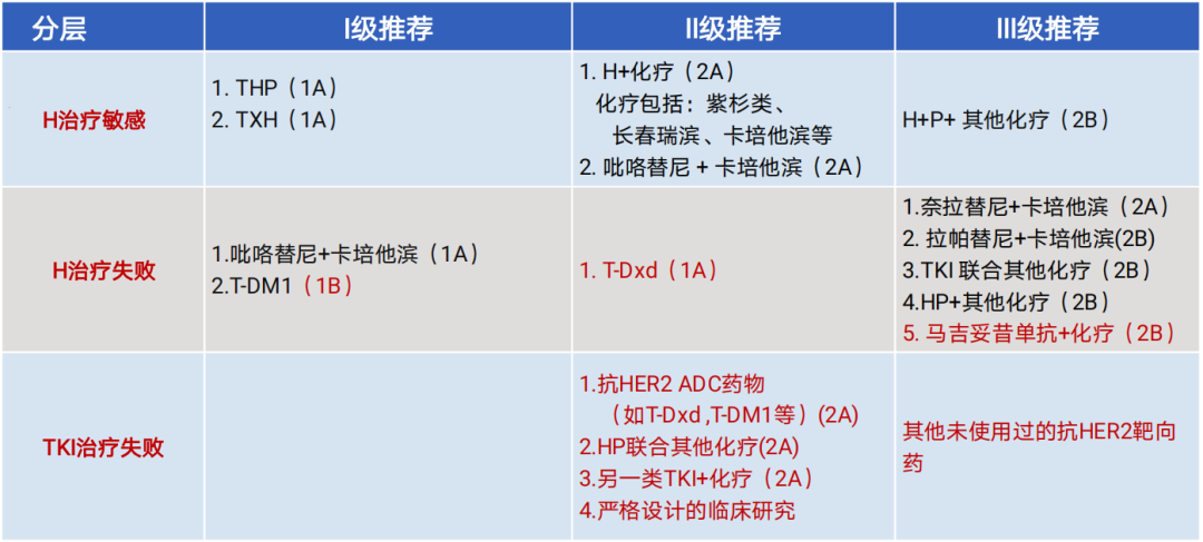2、在“H治疗失败”分层中,将T-DM1有II级调整为I级;II级推荐中新增T-DXd;拉帕替尼+卡培他滨有II级调整为III级;III级推荐中新增马吉妥昔单抗+化疗方案;TKI药物新增图卡替尼。