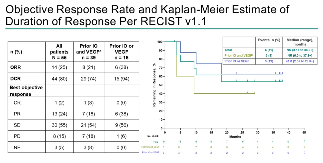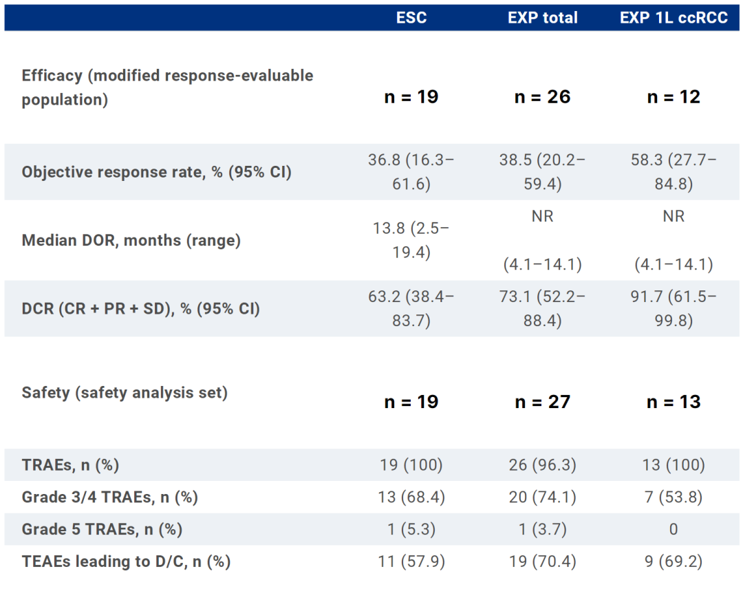该研究共入组了46例经治的晚期肾癌患者,包括剂量递增阶段(ESC)19例和扩展阶段(EXP)27例。这些患者中有69.2%为IMDC中/低危。结果显示,MEDI5752治疗的ORR为36.8%(ESC)~38.5%(EXP),DCR为63.2%~73.1%,中位DCR为13.8个月~NR;而EXP一线治疗患者的ORR和DCR则可达58.3%和91.7%。但安全性方面显示毒性作用似乎也有所增加,3/4级TRAEs为68.4%~74.1%,治疗中断率也达57.9%~70.4%。为了更好地确定风险-获益,该研究将在一线治疗扩展队列中摸索新的治疗剂量。