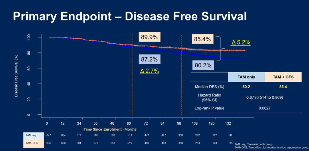 本次大会更新了其8年随访结果。中位随访106.4个月,TAM+OFS组的8年DFS率仍优于TAM组(85.4%vs.80.2%,HR:0.67,95%CI:0.51~0.87)。TAM+OFS组的DFS事件发生率低于TAM组(14.6%vs.25.1%),除局部区域复发及远处转移外,TAM+OFS组的对侧乳腺癌发生率较高(1.4%vs.0.8%),第二原发肿瘤的发生率较低(1.3%vs.2.6%)。