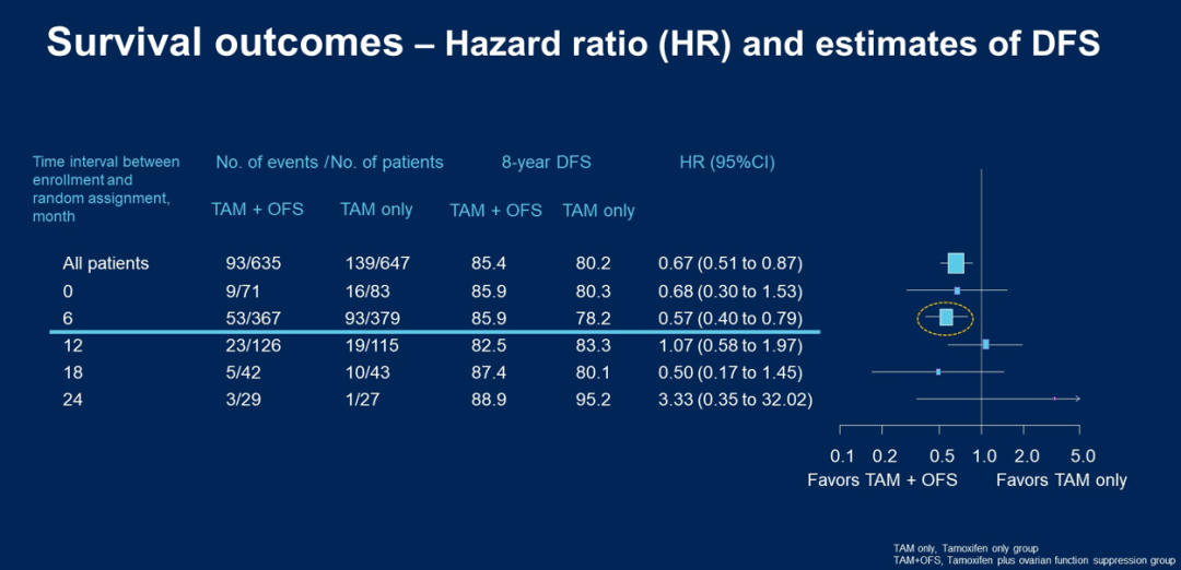 本次更新的数据表明,随着时间的推移,在TAM治疗时联合2年OFS的生存优势是一致的,对于那些仍处于绝经前状态或化疗后卵巢功能恢复的患者,应考虑在TAM治疗基础上联合OFS。