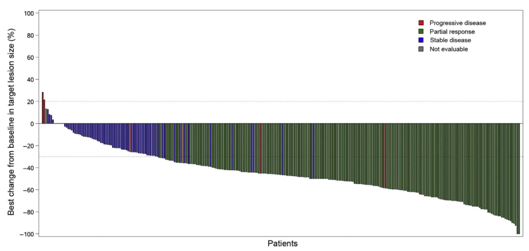 该队列仅仅用了1年左右的时间,就完成了689例患者的筛查及290例患者的入组。其中,73.1%(212/290)的患者可耐受,顺利爬坡至100 mg进行后续的治疗。数据分析时,近1/3(29.7%)的患者仍然在接受治疗。独立评审委员会评估的ORR和中位PFS分别为67.6%和16.6个月,中位DOR更是达到18.0个月(再次强调,这是二线的数据哦),研究者评估的ORR及中位PFS分别为65.9%和12.5个月,中位DOR为12.4个月。可能读者已经发现了,独立评审委员会和研究者评估的ORR相似,但是中位PFS存在一定的差异,两组16.6个月和12.5个月的数据接近相差了4个月,此时,以哪个数据为准呢?通常,在临床试验中,独立评审委员会提供的数据往往比研究者评估的更为可靠。对于开放标签和单臂临床研究而言,由于整个研究并不设置盲法,使得研究者全程知晓患者究竟接受的何种治疗,虽然临床试验的疗效评估基于RECIST标准,但是,该标准并非是一个绝对客观的标准,这就可能导致研究者评估的数据会引入一定的评估偏倚从而影响数据的客观性,因此,对于单臂临床试验或开放标签的临床研究,独立评审委员会评估的数据往往更客观、更可信。