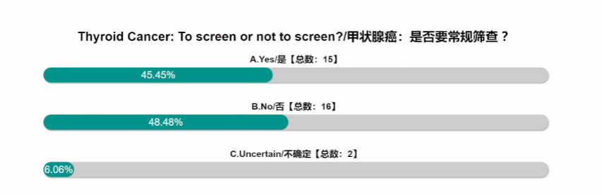 对于本问题,南京医科大学第一附属医院崔岱教授不推荐常规筛查,近年随着甲状腺癌筛查的普及,其检出率呈现激增的状况,以韩国最为明显,已有证据显示甲状腺癌的常规筛查可能存在过度诊疗。甲状腺癌属于低风险癌种,早诊断并未降低死亡率,且主动监测可以为患者带来明显获益,因此无需普遍筛查。高雄长庚纪念医院林暐哲教授表示癌症的筛查并不一定意味着必须实施治疗,而是为了深入了解肿瘤特性。通过筛查可以早期发现甲状腺癌患者,并开展主观监测,从而为出现进展的患者采取相应措施。只要平衡好治疗的风险与获益,常规筛查是无可厚非的。韩国蔚山大学首尔峨山医院宋永基教授(Dr. Young-Kee Shong)认为超声筛查无法为病灶较小的甲状腺癌带来获益,也无法发现微转移灶,且大多数甲状腺癌风险不高,因此不推荐常规筛查。