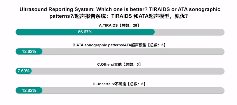 本问题由中日友好医院张波教授引导,67%的专家认为TIRAIDS更优,13%的专家认为ATA超声模型更优,20%的专家选择其他或不确定。