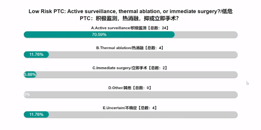 本问题由北京协和医院李小毅教授引导,其中71%的专家选择积极监测,12%的专家选择热消融,12%的专家不能确定,6%的专家选择立即手术。