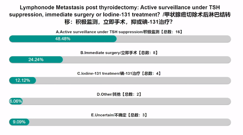 本问题由上海交通大学医学院附属仁济医院王卓颖教授引导,48%的专家推积极监测,24%的专家推荐立即手术,12%的专家推荐131I治疗,9%的专家不确定治疗手段,6%的专家选择其他治疗手段。
