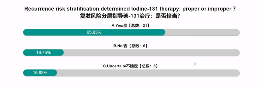 本问题由四川大学华西医院刘斌教授引导,66%的专家认为需要通过复发风险分层指导131I治疗,19%的专家对此持否定态度,16%的专家不确定。
