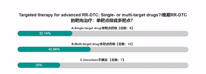上海市东方医院(同济大学附属东方医院)郭晔教授引导了此问题的投票与讨论,43%的专家选择多靶点药物,32%的专家选择了单靶点药物,25%的专家选择 “不能确定”。