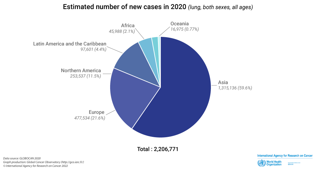 世界卫生组织(WHO)国际癌症研究机构(IARC)发布的2020年全球癌症数据显示,全球肺癌新发病例逾220万,位居第二位,死亡病例约180万例,死亡率位居榜首。