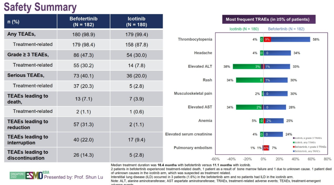 安全性方面,贝福替尼一线治疗常见的不良反应主要包括血小板减少、头痛、肝酶升高、皮疹等,程度多为1-2级,整体安全可耐受。