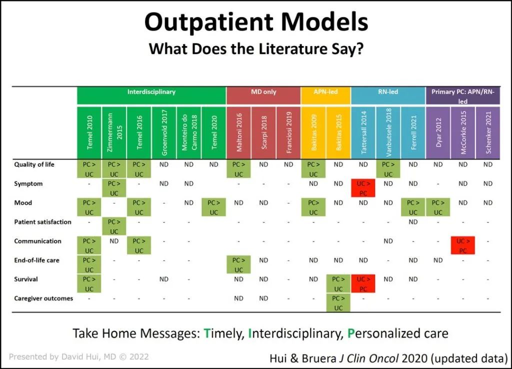 自从这些结果发布后,多项比较门诊姑息治疗和常规肿瘤学治疗的随机对照试验开始(幻灯片2)。“正如你所看到的,所有这些研究都采用了不同的模型,”David Hu说。“有些研究中有跨学科团队;一些研究中只是医生;一些以高级专科护士为主;有的采取以护士主导的模式;有的采取初级保健医生为主导的模式。”