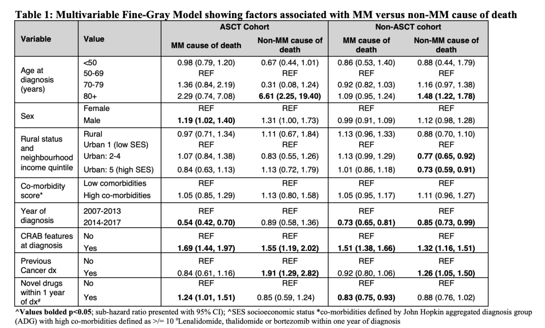 我们使用临床评估科学研究所(ICES)的数据进行了一项基于人群的回顾性研究,该数据库记录了加拿大安大略省公共资助医疗保健系统中的所有健康数据。使用ICD-O-3代码9732/3(MM)筛选2007~2018年间初诊的MM成年患者,并将其分为自体干细胞移植(ASCT)队列和非ASCT队列。主要死因是安大略省一般死亡数据库(ORGD)中登记的根本死因。我们估计了MM特异性死因和非MM死因的累积发生率。为了确定与MM特异性和非MM死因可能相关的预后因素,我们进行了竞争风险回归分析,并估计了针对协变量调整的多变量子分布风险比。