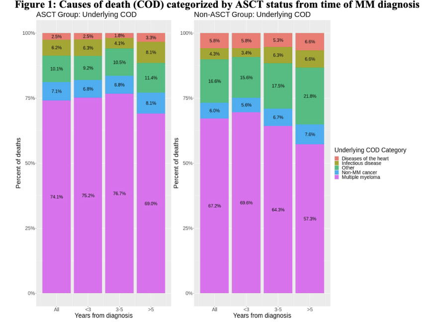 在整个疾病轨迹中,ASCT(5年时MM特异性:24.9%Vs.非MM死因:7.9%)和非ASCT队列(5年时MM特异性:47.6%Vs.非MM死因:22.5%)的MM特异性死亡累积发生率均高于非MM死因。ASCT和非ASCT队列的死亡原因按MM诊断时间(<3年,3-5年和>5年)分层如图1所示。MM肿瘤本身导致死亡是ASCT(74%)和非ASCT队列(67%)在整个疾病轨迹中最常见的死亡原因;其他肿瘤原因占ASCT组死亡人数的7%,占非ASCT组的6%。ASCT组和非ASCT组共有2.5%和5.8%的患者死于心脏病,6.2%和4.3%的患者死于感染性疾病。其他潜在死亡原因(包括但不限于痴呆相关疾病,肾脏和肝脏疾病,非心脏血管疾病和呼吸系统疾病)分别占ASCT和非ASCT队列死亡人数的10.1%和16.6%。