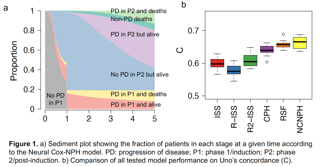 纳入1840名患者,其临床和基因组数据来自以下队列:MMRF CoMMpass(n=1062),MGP(n=492),Moffit AVATAR(n=177)和MSKCC(n=109)。中位随访时间为42个月。NDMM患者个体化的治疗调整预测模型涵盖160个变量(Palumbo et al.JCO 2015),包括临床特征(例如年龄、ECOG、性别、ISS等)、治疗方案、基因组学和时间依赖性治疗(如自体干细胞移植(ASCT)和持续治疗)等。多态模型设计了两个阶段:诱导阶段(阶段1)和诱导后阶段(阶段2)。阶段1包括以下患者:1)完成诱导而无进展(PD);2)诱导期间PD无缓解,仍然存活;3)诱导期间PD,随后死亡。阶段2患者:4)诱导后PD并存活;5)诱导后PD死亡;6)诱导后达到缓解并存活;7)诱导后缓解并且因其他原因死亡。生存分析统计方法采用基于深度神经网络(Neural Cox Non-proportional-hazards;NCNPH)、随机生存森林法(RSF)和Cox比例风险法(CPH)。